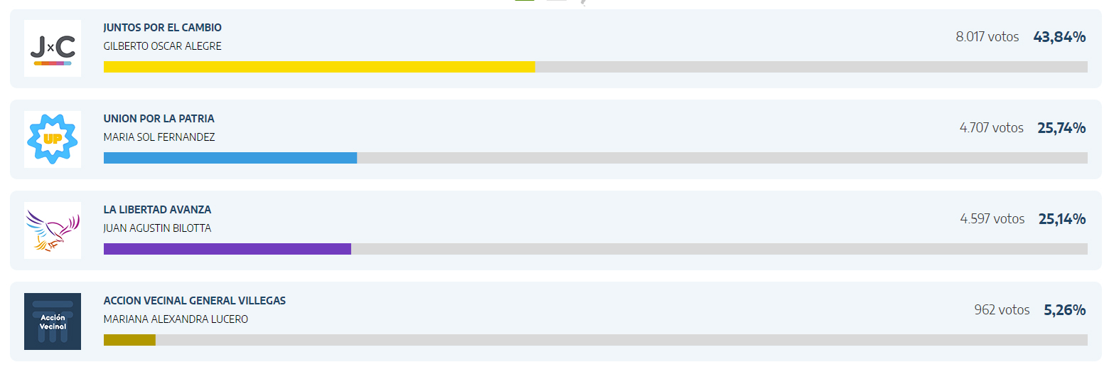 Con estos porcentajes Juntos por el Cambio logra el ingreso de 4 concejales que responderán al intendente, 2 por Unión por la Patria y 2 por Villegas Avanza.