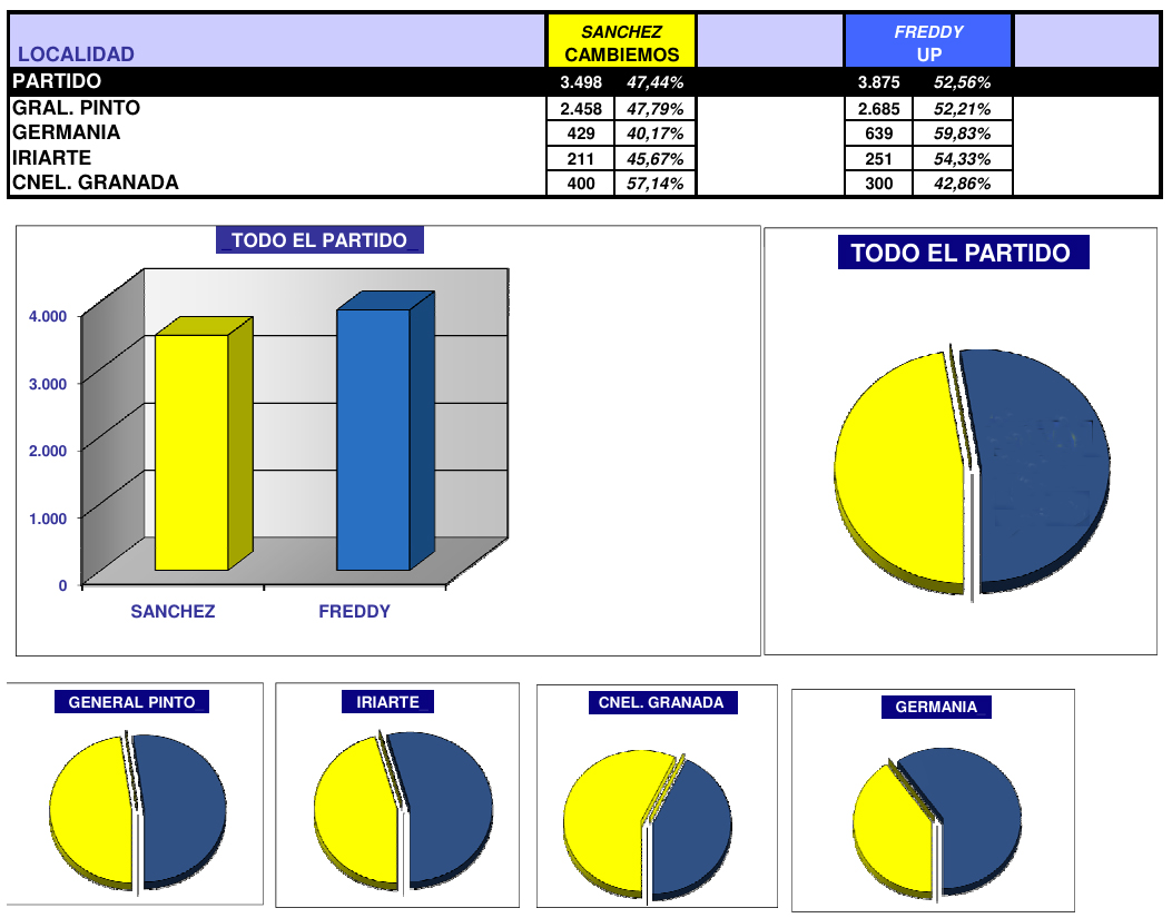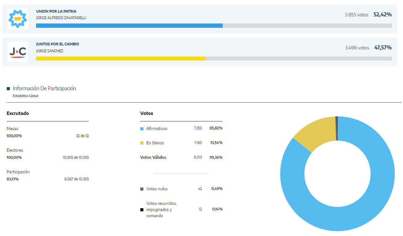 En el distrito gobernado por el intendente Freddy Zavatarelli que iba por su segundo período, se impuso el oficialismo. De este modo Unión por la Patria retuvo la Municipalidad por cuatro años, viendo modificado el mapa en el HCD que pasa a tener paridad.