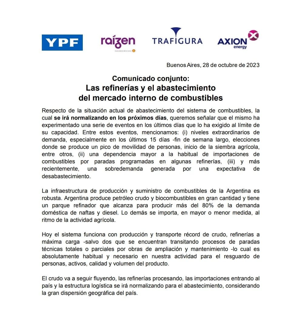 Las empresas YPF, Raizen, Trafigura y Axion explicaron que «el sector ha experimentado una serie de eventos en los últimos días que lo ha exigido al límite de su capacidad». Los detalles del comunicado.