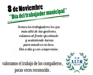 La Asociación Sindical de Trabajadores Municipales (ASTM) que conduce José Di Giacomo, hizo extensivo a todo el personal, más allá de se o no afiliados, el reconocimiento, además del saludo en su Día, por la loable labor cada jornada procurando tener un distrito cada vez mejor.