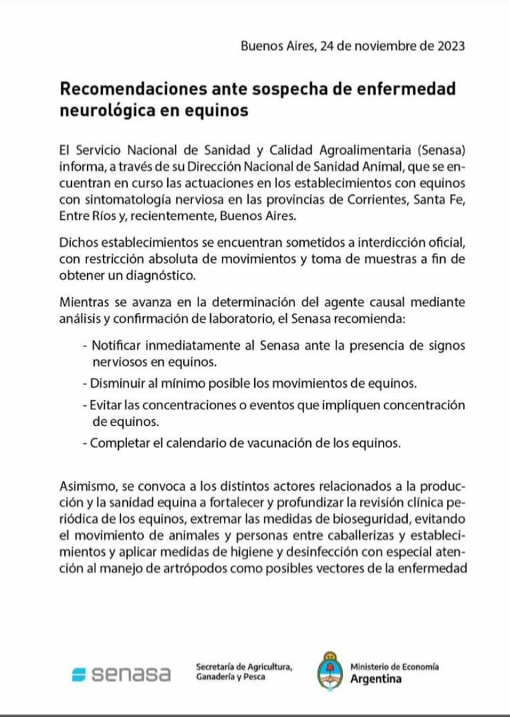 Por disposición del Servicio Nacional de Sanidad y Calidad Agroalimentaria (SENASA) queda suspendida la actividad de Juegos de Riendas que iba a realizarse mañana, en el marco de la Fiesta de la Vaquillona Asada con Cuero Germaniense.