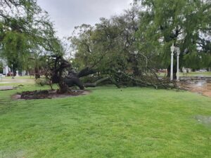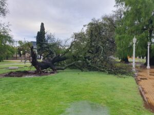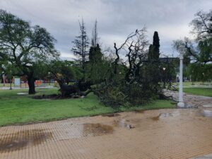 Esta mañana la Plaza Principal amaneció con un árbol de importante tamaño caído en el suelo. Los aproximadamente 85/90 milímetros medidos hasta las primeras horas seguramente contribuyeron para que sus raíces no lograran sostenerlo.