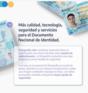 “El nuevo documento será impreso en láser sobre policarbonato, incorporando medidas técnicas de seguridad física para mejorar la seguridad, facilitar la verificación visual e impedir su falsificación; a la vez que el policarbonato es un material más resistente y duradero”.