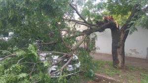El viento y la lluvia que se dio este mediodía en la ciudad generó una serie de inconvenientes y daños, tales como la caída de palmeras del servicio eléctrico y la voladura de un techo; también, la caída de este enorme gajo que quedó sobre un auto.