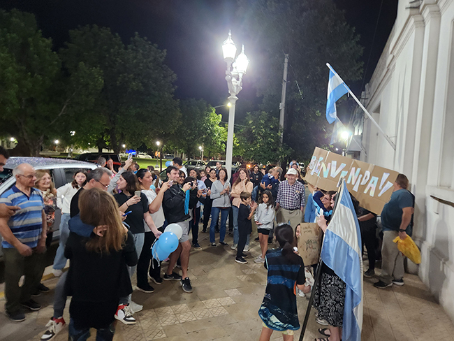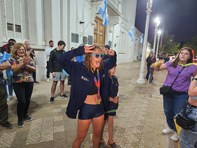 La columna de vehículos se detuvo frente al Palacio Municipal donde hubo tiempo para los saludos, los cánticos alusivos, las fotografías y una charla con Distrito Interior (que transmitió en vivo el momento) en la que la adolescente agradeció en todo momento el acompañamiento de la gente, de allí que su frase más contundente fuera que «traje las medallas para compartirlas con todos».
