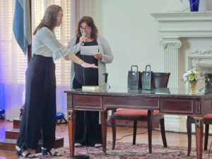 El total de las autoridades asumen este domingo, el primero de los actos fue la Jura de los consejeros escolares Karina Gianolio, Emiliano Penacino y Lorena Ogni.
