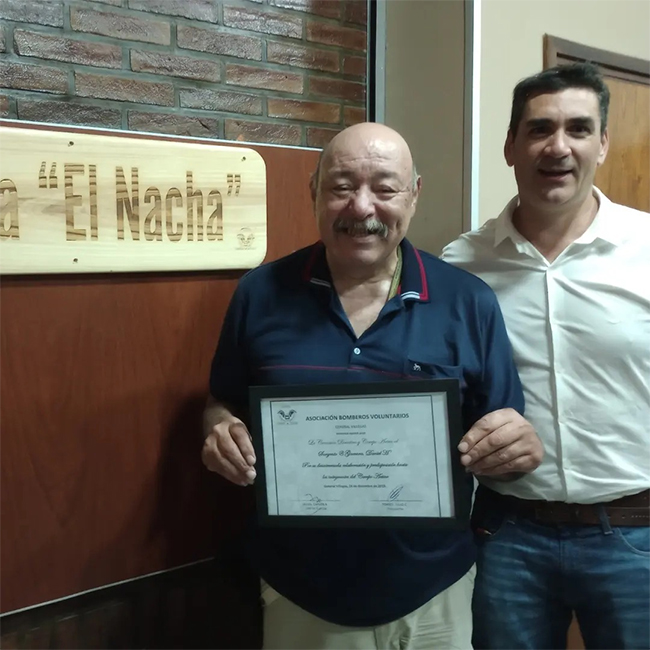 Otro de los reconocimientos, de carácter especial, fue a Daniel “Nacha” Guevara, integrante del Cuerpo de Reserva, quien se destaca por su permanente predisposición hacia los bomberos, «es quien sin dudarlo se prende un fueguito para hacerles algo rico cuando regresan de algún servicio, o están trabajando en el cuartel»
