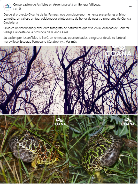 El veterinario es un aficionado a la fotografía silvestre y su pasión por los anfibios lo llevó, en reiteradas oportunidades, a registrar desde su lente al maravilloso Escuerzo Pampeano (Ceratophrys ornata), y como Silvio es una persona muy comprometida con la conservación de la biodiversidad, no dudó en compartir sus hallazgos con el proyecto Gigante de las Pampas, expresaron desde COANA.