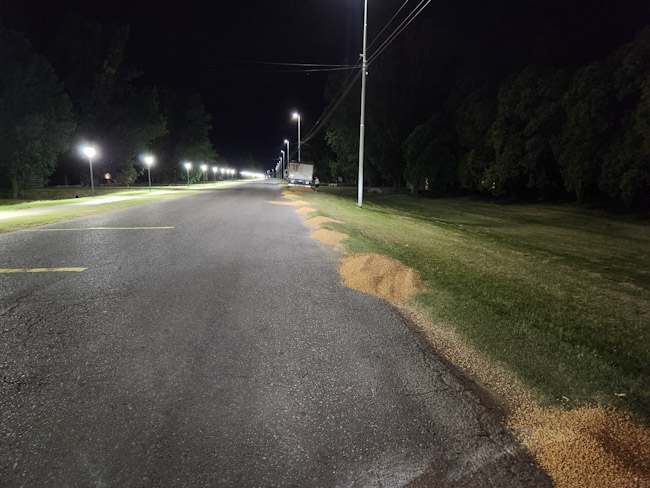 Según testigos, cuando subió al acceso se abrió la puerta trasera del acoplado derramando una impoartante cantidad de maíz que quedó una parte sobre la Avenida y otra, la mayoría sobre el asfalto.