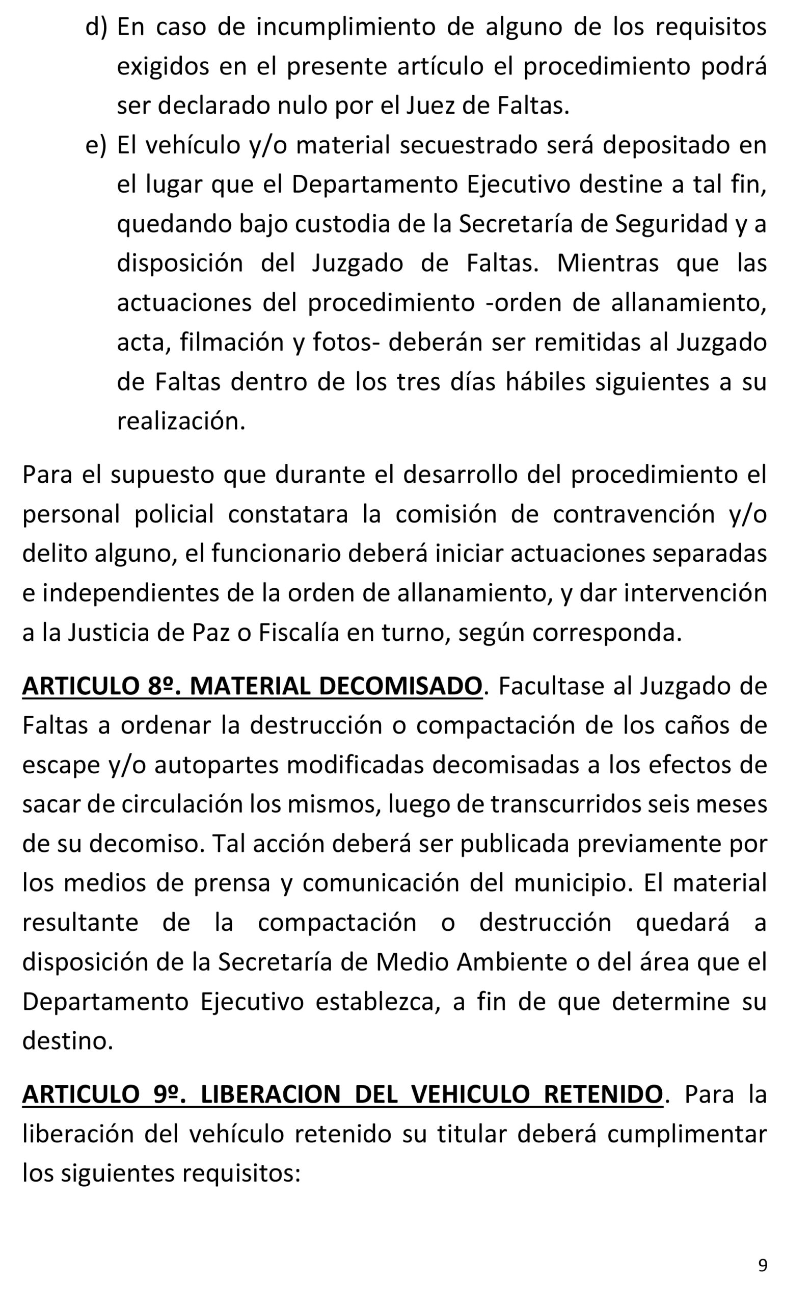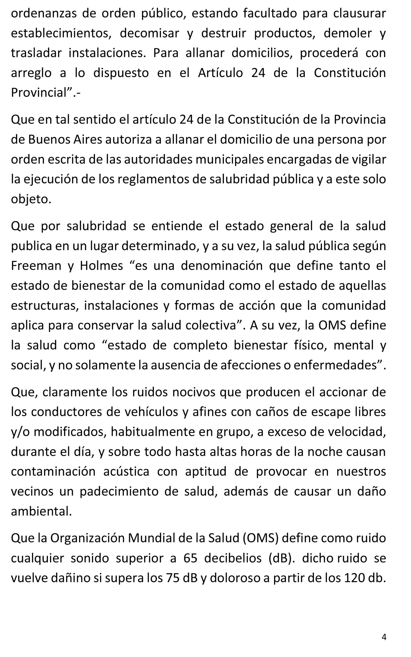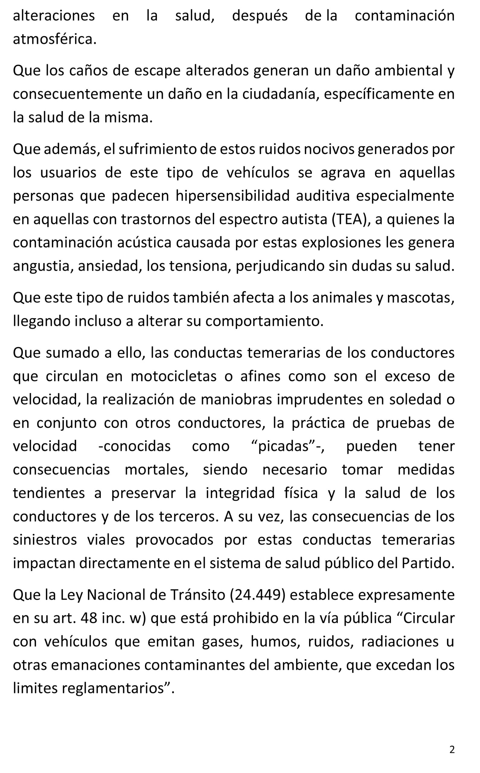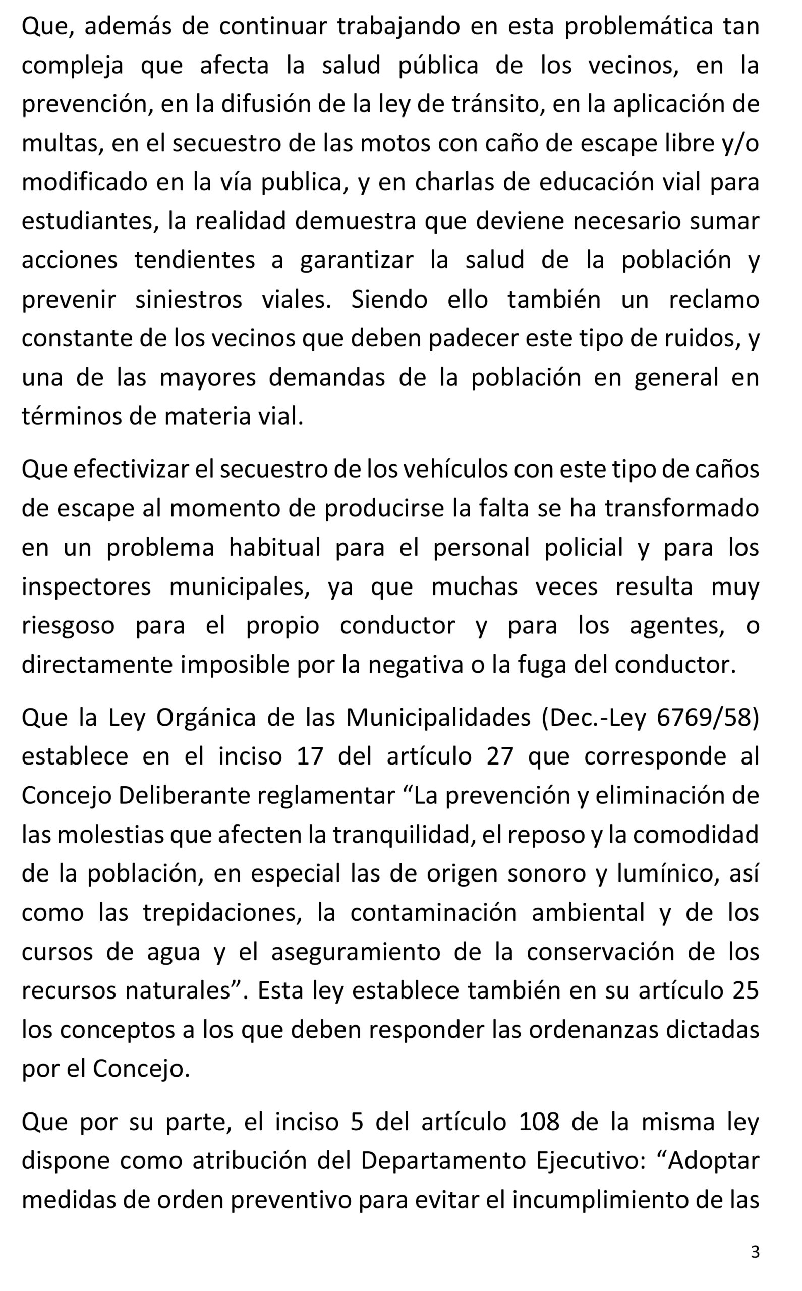 De inminente aplicación esta ordenanza no solamente persigue la idea y necesidad de minimizar los ruidos provocados por las motos con escapes alterados, sino cuidar también a aquellos motociclistas que con sus hábitos ponen en riesgo la vida de terceros y las propias, incluso en muchos casos perdiéndola en un accidente o incidente de tránsito que pudo haberse evitado, destacó oportunamente el funcionario, quien en diferentes ocasiones apeló a la ciudadanía en general a aportar en la toma de conciencia y el compromiso para lograr el bien común.
