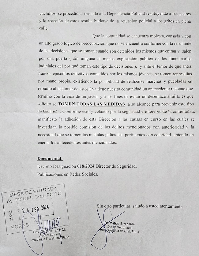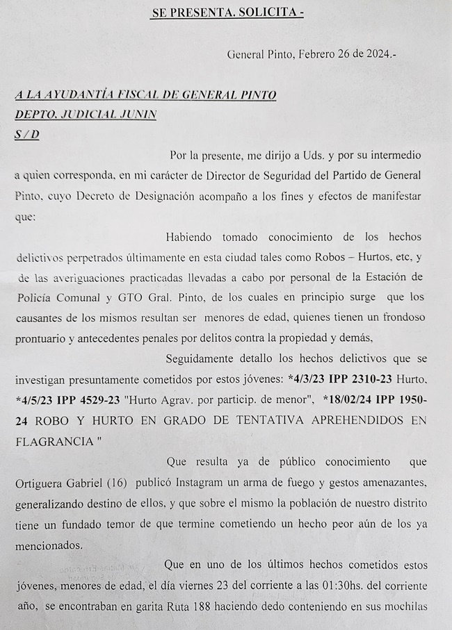 El Intendente de General Pinto realizó una presentación judicial por escrito que será elevada ante el Fiscal General a los fines de alertar sobre la situación general y la alarma las alarmas que se encienden en la comunidad. También manifiesta «la preocupación por los hechos ocurridos en estos días en relación a menores de edad cometiendo hurtos y robos en nuestra Ciudad».