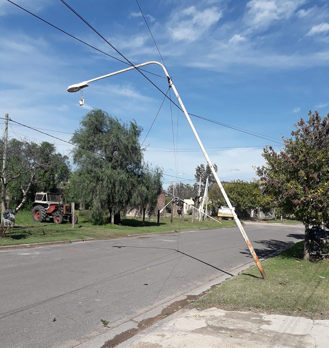 Esta tarde, luego de la lluvia, comenzó a soplar un viento intenso que provocó el quiebre, en sus bases, de dos columnas de hierro pertenecientes al alumbrado público.