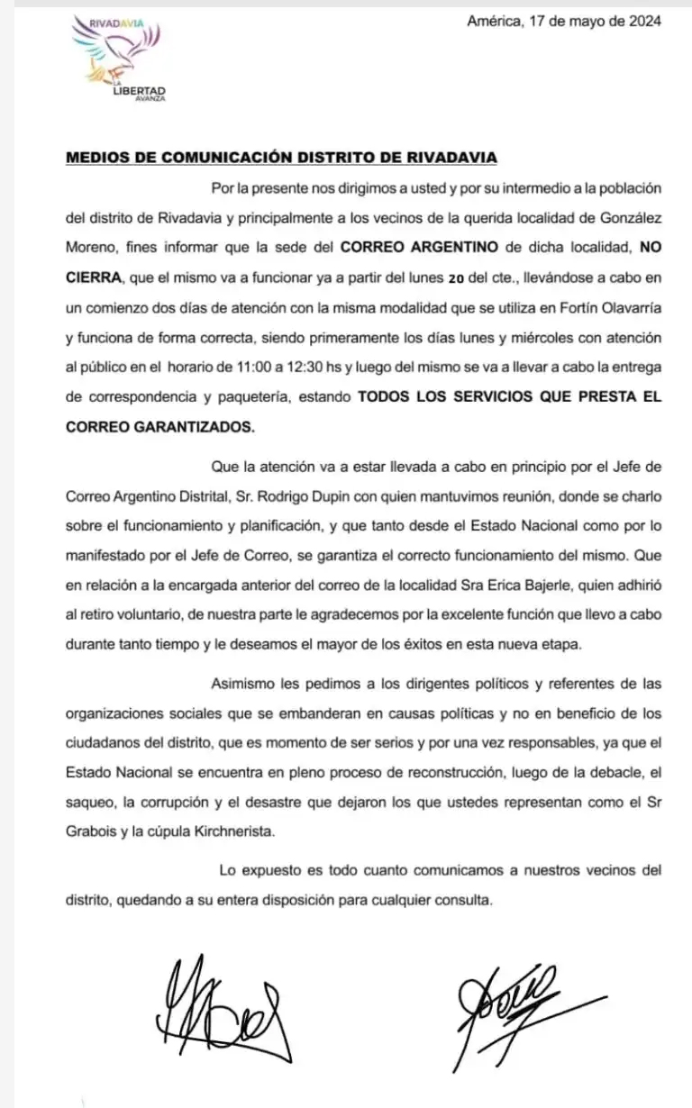Así lo informaron a través de un comunicado de prensa los referentes de La Libertad Avanza del vecino distrito de Rivadavia al que pertenece Gonzales Moreno.