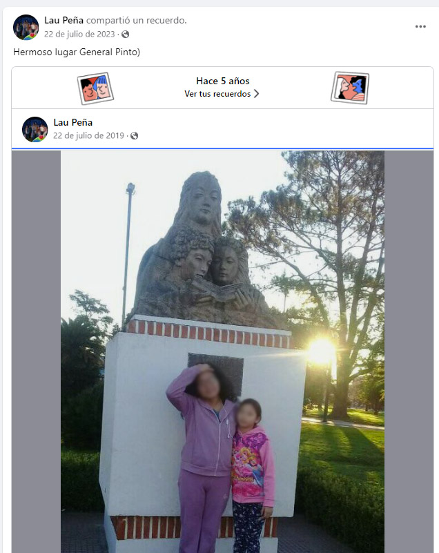 Laudelina Peña compartió en sus red social Facebook, un recuerdo del año 2019, en 2023, que la sitúa en la ciudad cabecera, mediante una foto en la que se ve a sus hijas posando en el busto a la Madre, en la Plaza Principal, a la que acompaña con la inscripción «Hermoso lugar General Pinto.