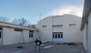 - Exterior: Terminaciones de albañilería y pintura sobre fachadas exteriores, ejecución de nuevas veredas de hormigón, colocación de canaletas, ejecución de cajón de terminación de frente y cielorraso suspendido, y terminación de nuevo ingreso principal.