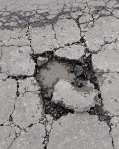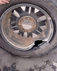 Luego haber impactado con un pozo y verse obligada que frenar debido a la rotura de la llanta se acercó al pozo que causó el daño pudiendo observar que se había desprendido un trozo de asfalto.