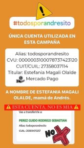 En las últimas horas detectaron cuentas falsas que utilizan el nombre de Andrés Monterrosa o el nombre de la campaña «Todos por Andresito» para cometer estafas, haciendo que se desvíen las transferencias.
