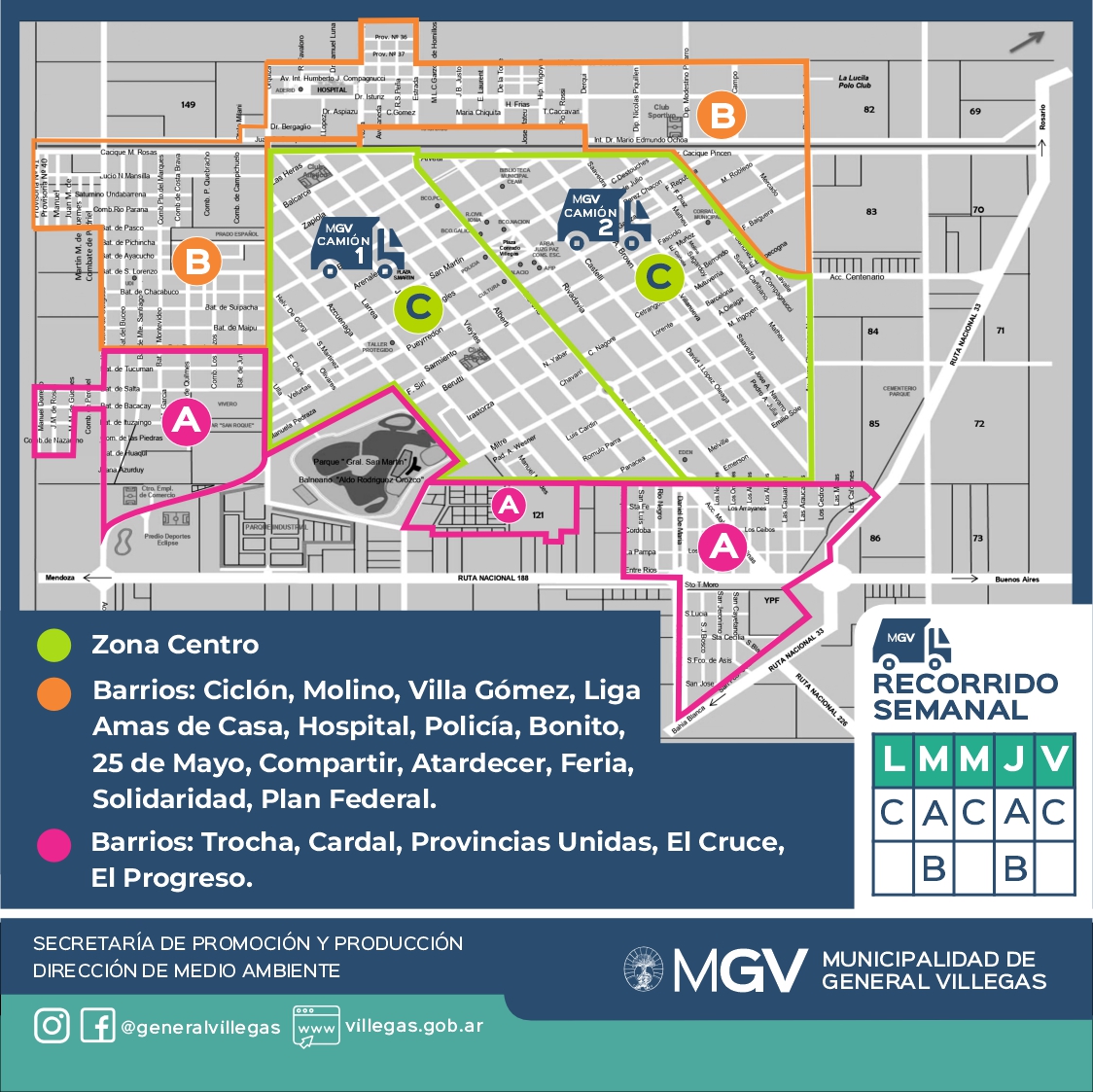 La municipalidad de General Villegas posee su propio sistema de recolección de residuos domiciliarios, a cargo de la Subsecretaría de Servicios Urbanos. Cuenta con unidades de recolección de residuos (camiones compactadores – recolectores) y personal específico. La frecuencia en días y horarios varía según los barrios y las zonas, con el siguiente formato