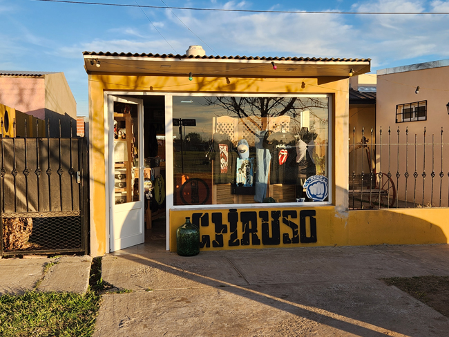 En General Villegas una tienda de ropa utiliza una damajuana con corchos en el interior para indicar si está abierto o cerrado