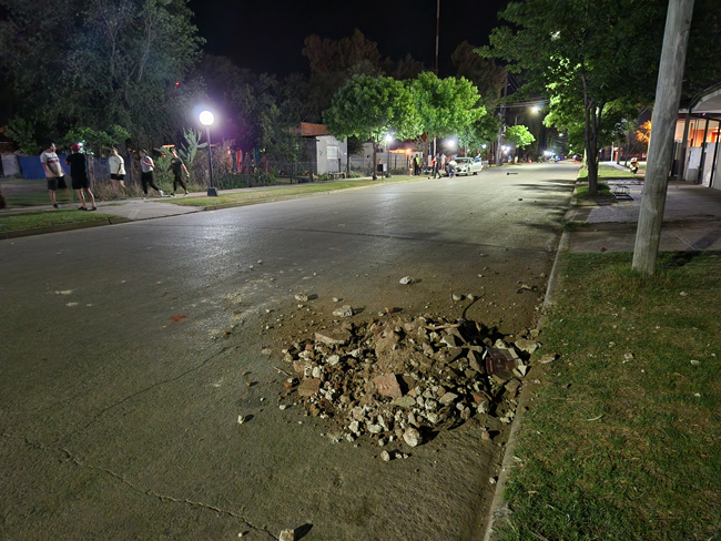 De acuerdo a lo que se aprecia, el motociclista luego de superar el reductor de velocidad, no está claro si pasando sobre éste o evitándolo por un costado, choca un montículo de escombros que se encontraba sobre la Avenida Alvear, entre Castelli y Rivadavia, lo que genera que se desvíe hacia el auto que estaba estacionado sobre la mano contraria, frente a la vivienda de sus dueños, impactándolo de frente con las consecuencias materiales que se aprecian.
