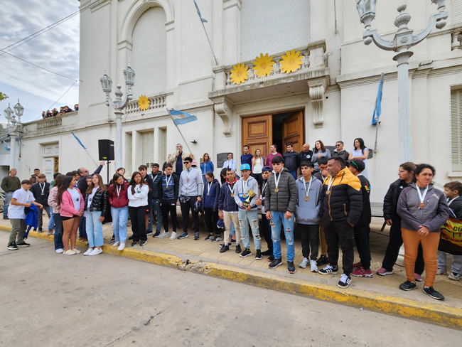 Uno a uno fueron subiendo al escenario montado para la ocasión donde se los mencionó y felicitó por la obtención; el intendente, único orador, resaltó los resultados, no solo deportivos, sino por el comportamiento de todos, más allá del episodio por el que seis jóvenes con sus profesores fueron traídos de regreso anticipadamente, episodio al que no hizo referencia. El mandatario dijo que la experiencia vivida en la ciudad costera será un recuerdo que llevaran consigo toda la vida y les agradeció por la representación.