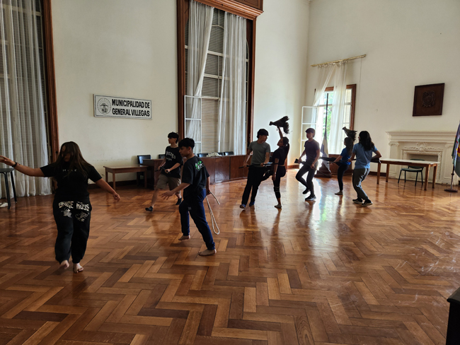 Gastón Courreges, director de la Escuela Municipal de Tango y Folclore y el coreógrafo Luciano Garbuio, ensayan cada sábado y domingo en el primer piso del Palacio Municipal, ultimando los detalles de la coreografía con la que se representará «La Guerra al Malón», inspirada en el libro del Comandante Manuel Prado.
