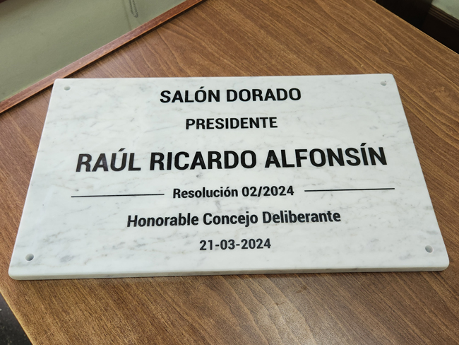 La concejal por la UCR y presidente del Concejo Deliberante, Claudia Esaín, confirmó a Distrito Interior, que luego de una reunión mantenida con el intendente municipal, acordaron que el día 10 de diciembre será colocada formalmente la placa mediante la cual queda formalmente identificado con el nombre del ex presidente Raúl Ricardo Alfonsín el salón Dorado, donde sesiona el Cuerpo Legislativo.
