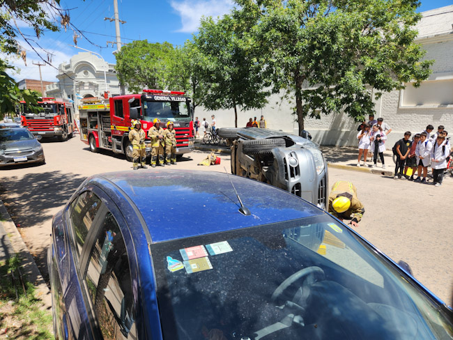 Producto del impacto el Fox quedó volcado en el medio de la calle, sobre su lateral izquierdo, quedando la mujer atrapada en el habitáculo sin poder salir por sus propios medios, lo que demandó por parte de personal del SAME, Bomberos y Policía un intenso y prolongado trabajo hasta su rescate.