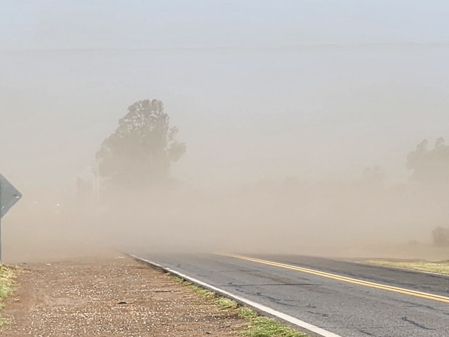 La tierra que vuela desde un feed lot qué se encuentra a la derecha disminuye la visibilidad prácticamente al mínimo.