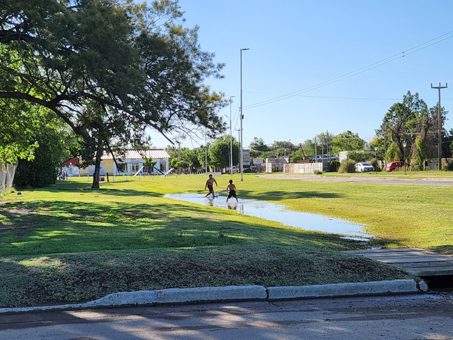 El domingo hasta entrada la tarde la lluvia fue persistente, luego de unos 90 milímetros, casi de repente cesaron las precipitaciones y en cuestión de minutos asomó el sol; se dieron todas las condiciones para que algunos lugares de la ciudad de General Villegas donde el agua, que había comenzado a escurrir lenta, se prestaba para que por instinto los chicos del barrio vieran allí, en los charcos, una oportunidad para ejercer la infancia como ocurría hace años.