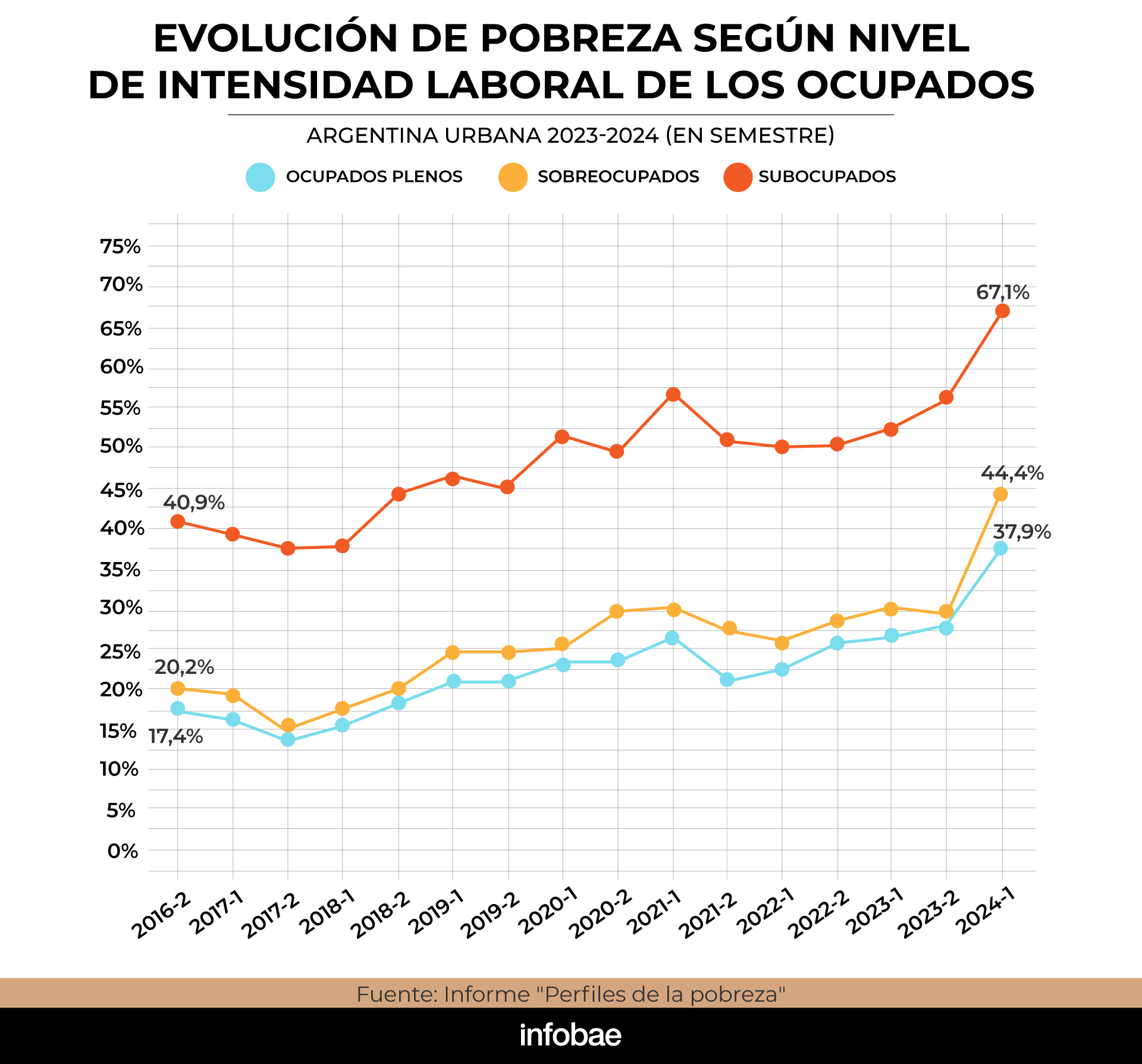 El trabajo también divide a los trabajadores según su intensidad laboral en ocupados plenos, sobreocupados y subocupados. En este último grupo, que incluye a quienes trabajan menos horas de las deseadas o necesarias, hubo “un fuerte crecimiento de la pobreza, que pasó del 40,9% en 2016 al 67,1% en 2024, mostrando su alta vulnerabilidad frente a los ingresos insuficientes que suelen caracterizar a este tipo de empleo”.