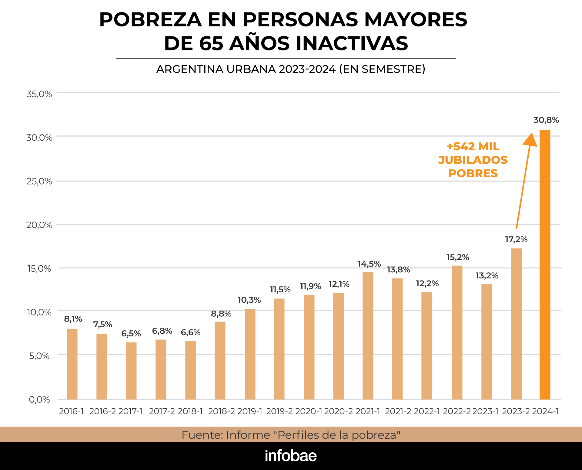 Durante el último año, la incidencia de la pobreza dentro de los jubilados creció más del doble, con el registro de 17,6 puntos porcentuales ya que pasó del 13,2% en el primer semestre de 2023 al 30,8% en el primer semestre de 2024. “Este dato revela que 1 de cada 3 jubilados es pobre en la Argentina y que durante el último año más de medio millón de jubilados (542 mil) ingresaron a la situación de pobreza”, según un estudio privado.
