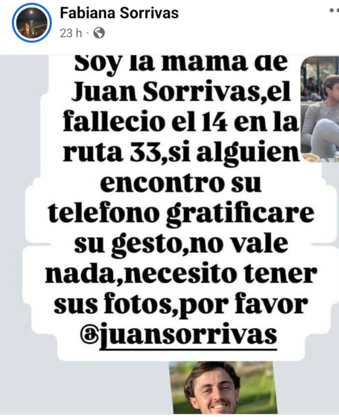 Al respecto, y haciendo uso de las historias tanto de Facebook como de Instagram, la señora escribió: “Soy la mamá de Juan Sorrivas, él falleció el 14 en la ruta 33. Si alguien encontró su teléfono gratificaré su gesto. No vale nada, necesito tener sus fotos, por favor”.