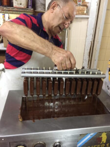 Eduardo Oscar Alvarez, «El Pelado» elaborando, dueño de la heladería que conserva el sistema SAAC