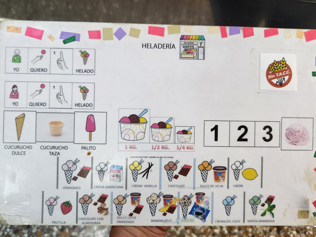En una de las tantas visitas a la tradicional heladería, con más de 40 años elaborando artesanalmente, nos encontramos con este valioso documento, que no tiene sonidos, no está en una pantalla digital, pero resulta sumamente útil para un universo de personas que de otra manera, tal vez requerirían de un acompañante / intérprete para poder, algo tan simple para la mayoría, pedir un helado, indicar su tamaño (o precio) y los sabores.