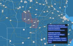 Para nuestra zona, un Alerta por tormentas fuertes, caída de granizo y vientos, tal como muestra el gráfico del Servicio Meteorológico nacional.