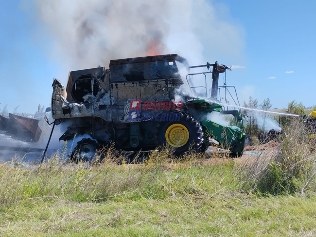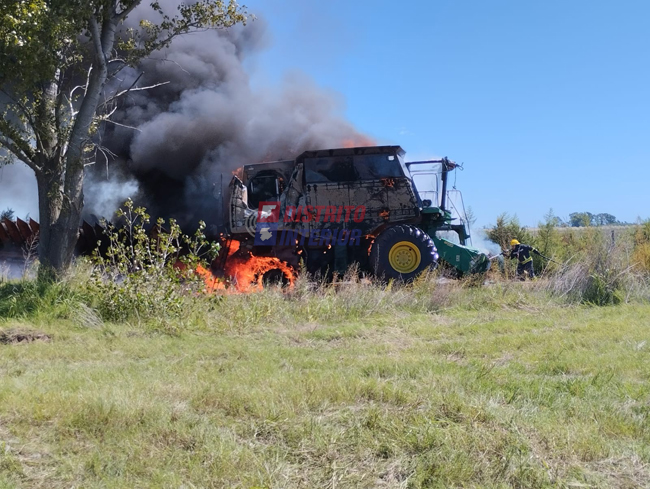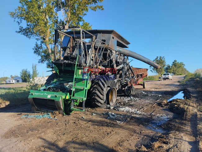 La cosechadora marca John Deere, que tiraba una plataforma maicera, se incendió mientras circulaba por un camino rural, cuando había hecho apenas unos metros de la Ruta 188, de donde acababa de bajar.