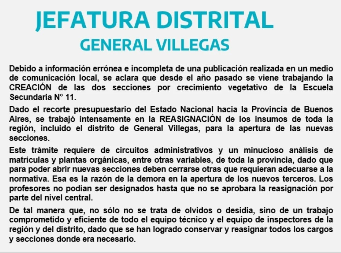 Luego que Distrito Interior informara el inicio del ciclo lectivo por parte de los alumnos del tercer año de la EES N° 11 de General Villegas, tras una semana de demora respecto al mismo año de los otros colegios secundarios de todo el distrito, publicación en la que se detalló, que ante la ausencia de una explicación por parte de las autoridades de la Jefatura de Distrito (a pesar de los intentos por obtenerla), ello había dado lugar a especulaciones como un olvido en la tramitación correspondiente, entre otras posibles; desde la Jefatura, cuya titular es Susana Garat, se emitió un comunicado, aclarando que tal información es falsa. Aún así, las explicaciones, no fueron dadas.