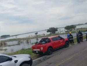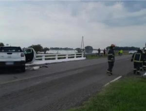 Ello es derivación de un cruento accidente de tránsito ocurrido aproximadamente a las 11:00 de la mañana de este sábado sobre el puente de este canal que deriva importantes caudales de agua hacia el arroyo Vallimanca.
