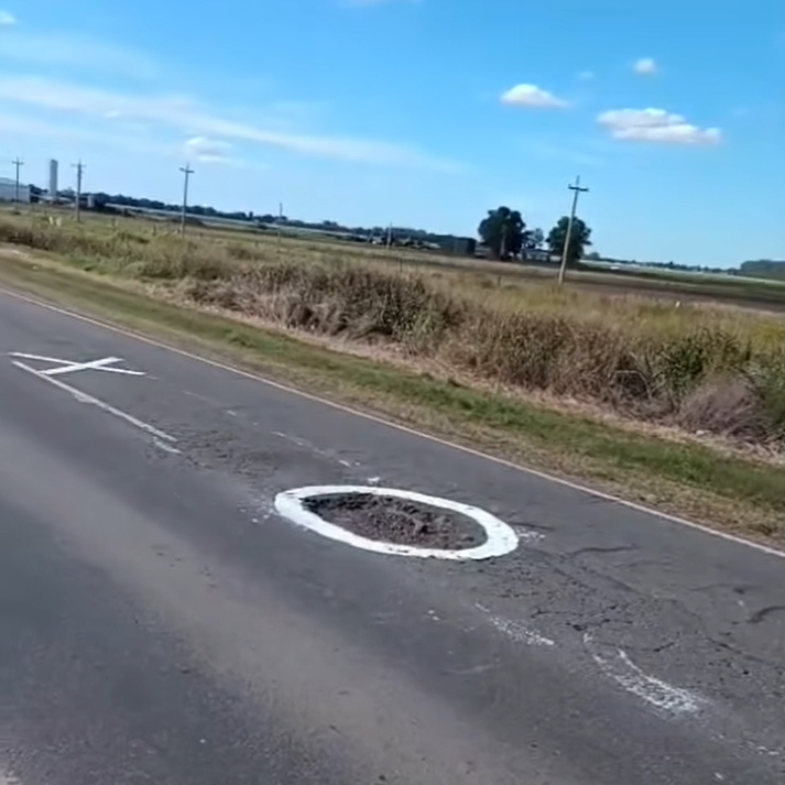 Pintó los pozos de la Ruta 33 para evitar accidentes y roturas, luego se tomó una foto adentro de uno para mostrar el tamaño