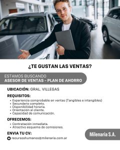 La firma Milenaria S.A. concesionario oficial Chevrolet se encuentra en la búsqueda de un/a Asesor/a de Ventas – Plan de Ahorro.