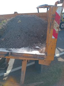 En la tarde, con equipos de Bunge se procedió a sanear el lugar, sacando por completo el riel que se asomaba y colocando asfalto frío tierra hasta su reparación.
