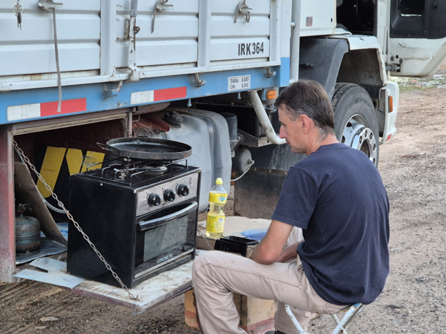Esta es la vida del camionero, comentó. Lleva 25 años conduciendo camiones y se le nota el gusto por lo que hace.
