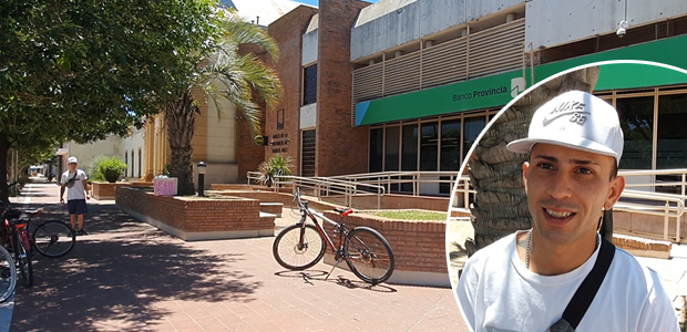 Francisco Muro es de General PInto y ante la falta de trabajo, él se dedica a la pintura y la albañilería, decidió vender en la puerta d ela sucursal del único banco de General Pinto, las ensaladas de fruta que elabora su novia, quien las comercializa a través de las redes sociales.