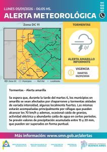 Se espera que, con el avance de un frente frío durante el martes 6/1, los municipios en amarillo, entre ello General Villegas y General Pinto, se vean afectados a partir de la tarde por chaparrones y tormentas aisladas de variada intensidad, algunas localmente fuertes. Las mismas estarán acompañadas principalmente por ráfagas que pueden alcanzar los 70 km/h, y además, actividad eléctrica, abundante caída de agua en cortos períodos y ocasional caída de granizo.