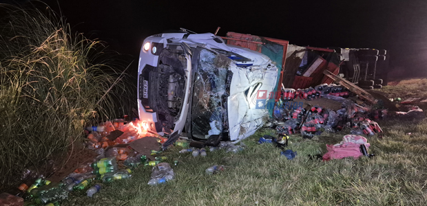 Al intentar volver al asfalto se produjo el vuelco que dejó la cabina totalmente dañada y chasis y acoplado volcados sobre uno de los laterales, el chasis quedó «mirando» hacia la ruta y el acoplado hacia el alambrado, en ambos casos con la carga desparramada por completo. El chasis transportaba gaseosas y el acoplado alimento para mascotas.