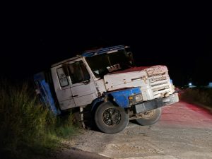 Desde la medianoche los bomberos voluntarios trabajan para retirar un camión Scania que al maniobrar en reversa cayo dentro de un zanjón que sencuentra paralelo a la calle lateral conocida como la bajada de la hormigonera.