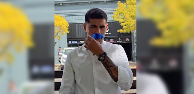 Con un video en el que se lo ve quitándose una cinta de la boca, asegurando que a pesar de que quieren callar, se manifiesta públicamente, incluso, se dirige sobre el final al propio presidente de la Nación.