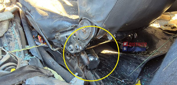 Debajo de su asiento, como se aprecia en la foto, se encontraba un termo, elemento que claramente se observa trabado debajo, impidiendo el desplazamiento hacia atrás, incluso, parece que la guía está torcida. Más allá de cualquier especulación, el asiento no cedió.