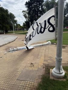 El efecto del viento derribó y destruyó la farola que fue arrancada de su base.